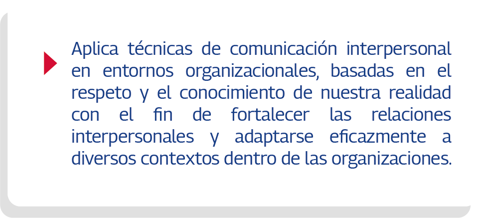 Aplica técnicas de comunicación interpersonal en entornos organizacionales, basadas en el respeto y el conocimiento de nuestra realidad con el fin de fortalecer las relaciones interpersonales y adaptarse eficazmente a diversos contextos dentro de las organizaciones