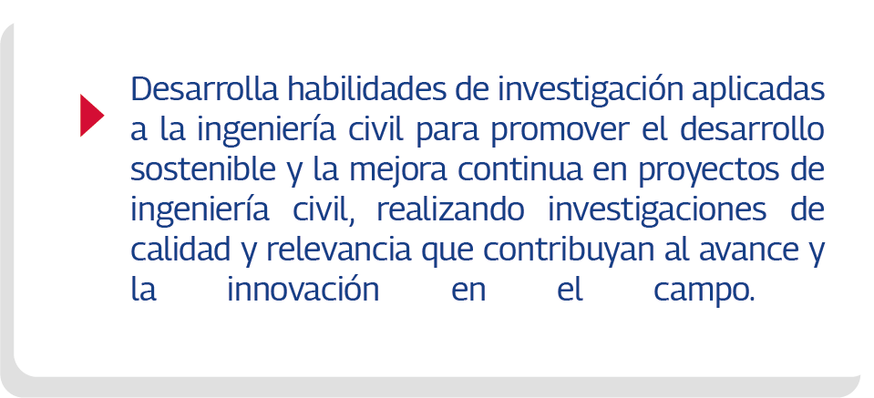 Desarrolla habilidades de investigación aplicadas a la ingeniería civil para promover el desarrollo sostenible y la mejora continua en proyectos de ingeniería civil, realizando investigaciones de calidad y relevancia que contribuyan al avance y la innovación en el campo.