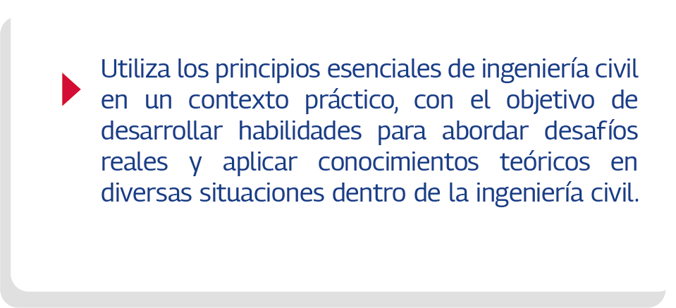 Utiliza los principios esenciales de ingeniería civil en un contexto práctico, con el objetivo de desarrollar habilidades para abordar desafíos reales y aplicar conocimientos teóricos en diversas situaciones dentro de la ingeniería civil.