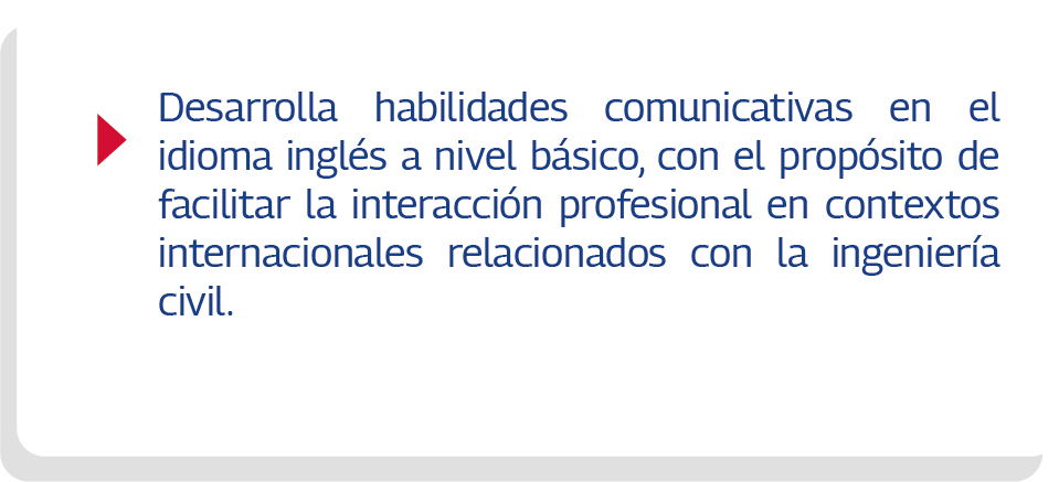 Desarrolla habilidades comunicativas en el idioma inglés a nivel básico, con el propósito de facilitar la interacción profesional en contextos internacionales relacionados con la ingeniería civil.